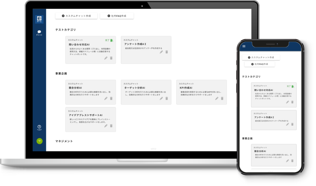 開発中AI | 理事会資料作成アシスタントAI・掲示板、お知らせ作成AI、管理規約改定アドバイザーAI、プレゼンシナリオ作成AI 等 |