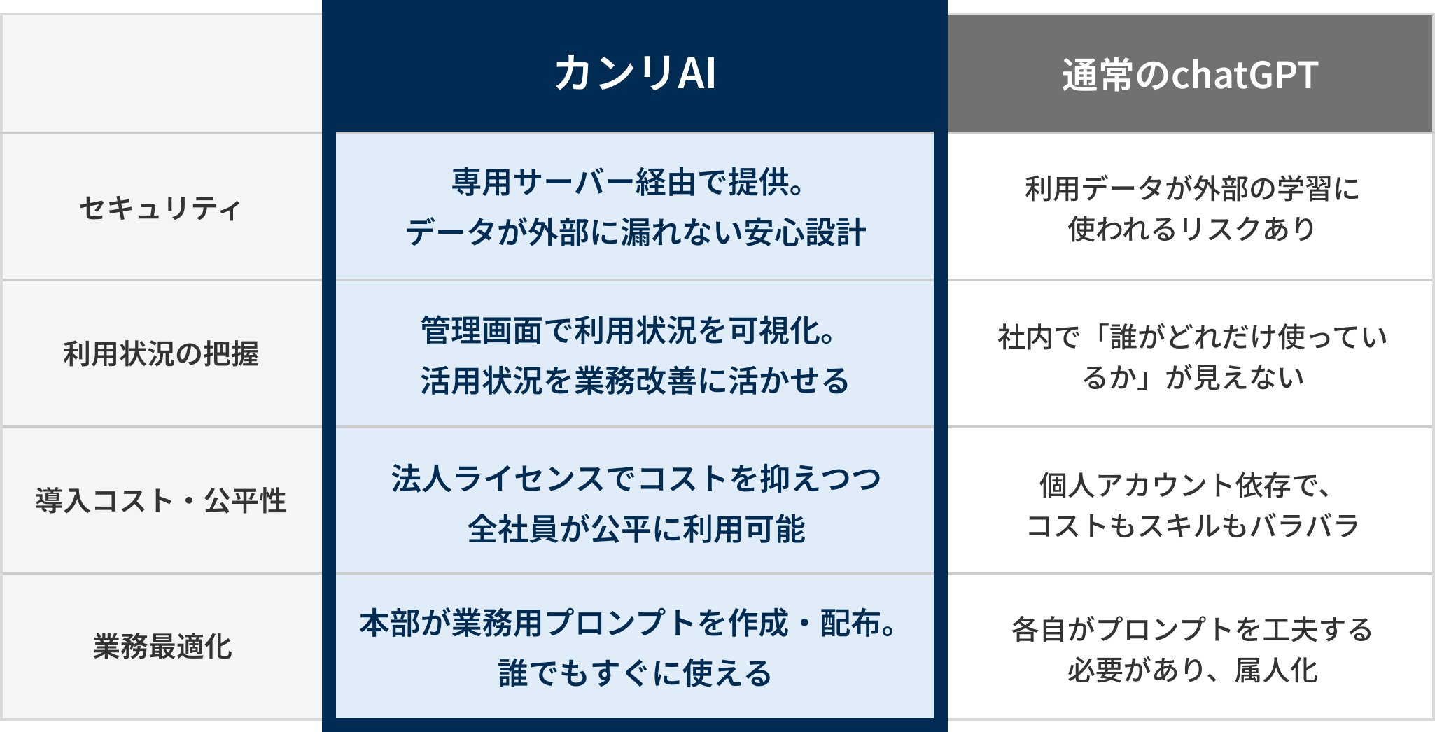 カンリAIとChatGPTは、同じLLM(大規模言語モデル)を使用しており、基本性能は同一です。ただし、情報管理方法や搭載機能において異なってきます。 ChatGPTは海外個人ユーザー利用を想定しており日本企業にとって不要な機能も多くあります。一方で、カンリAIは日本企業の業務活用に特化した機能を搭載しています。また情報管理方法も、ChatGPTはすべてのユーザーの情報を一元管理して学習に使用していますが、カンリAIは利用企業ごとに管理区画を分けて、かつ横断的な学習にも使用しません。 カンリAIは、ChatGPTを日本企業が簡単に、確実に、安心、安全に利用していただくために開発しています。